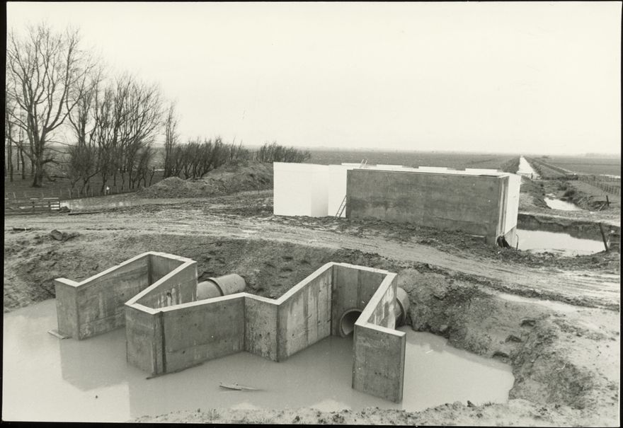Shown is a drainage pumping station as part of the Moutoa Farm Settlement project. The pumping station pumped water from a series of drainage systems into the Manawatu River.