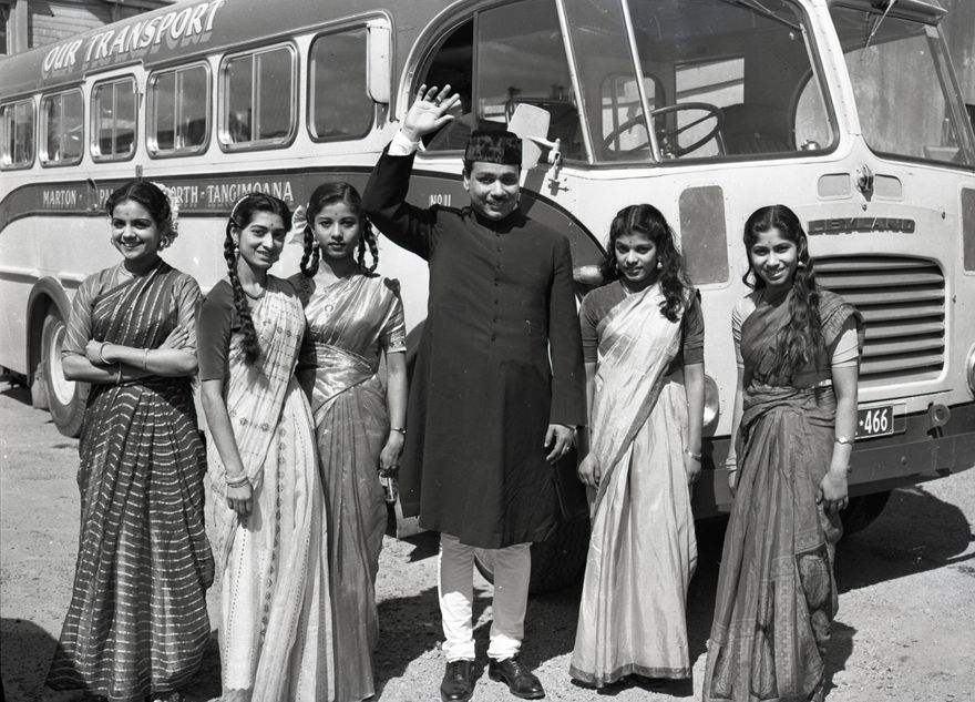 This photograph ran with the caption, "The Great Sorcar as he stepped off the bus from the aerodrome yesterday with the five girls in his company. They are all relatives of his and are, they say, enjoying our lovely country very much". Sorcar was a magician and illusionist from India, part of a family of traditional magicians. Among his stage attractions was the very realistic sawing of a lady in half and the Indian rope trick. He presented his show over several days in the Palmerston North's Opera House to capacity crowds.