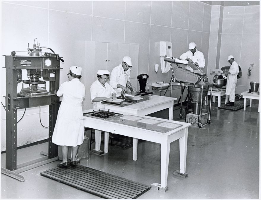 Production line staff preparing milk biscuits for manufacture and sale. The biscuits were developed by the Institute to distribute to children in under-developed areas particularly in Pacific and East Asian areas.