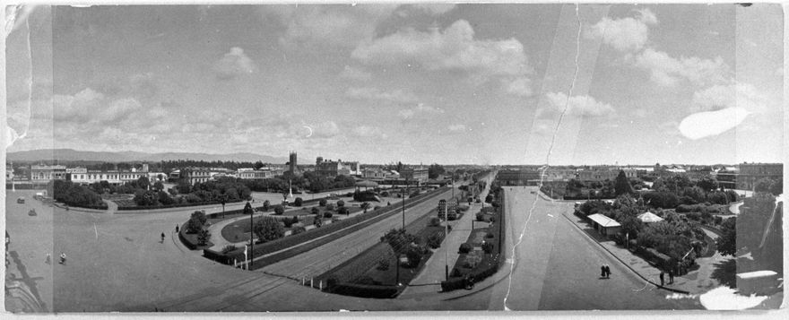 This panorama of The Square was taken from the top of the Post Office in The Square of Palmerston North. At this time The Square was divided into 4 quadrants and central strip, bisected by roads. the photograph must have been taken after 1914, because the rebuild of All Saints Church has been completed (the spire can be seen in the background on Church Street). Note the railway line running through The Square. The tracks ran through the Square until after the Milson Deviation was completed in 1959. In 1964 the last passenger train ran through the Square and the tracks were removed.