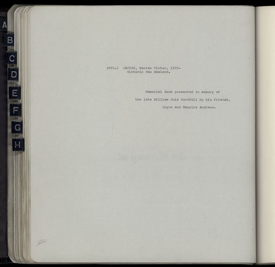 Memorial book with details of book donations to the Palmerston North Public Library and also memorial tributes to various Palmerston North residents, e.g. Audrey Gwendolen Adcock, Minnie Thomas, Charlotte Warburton and more.