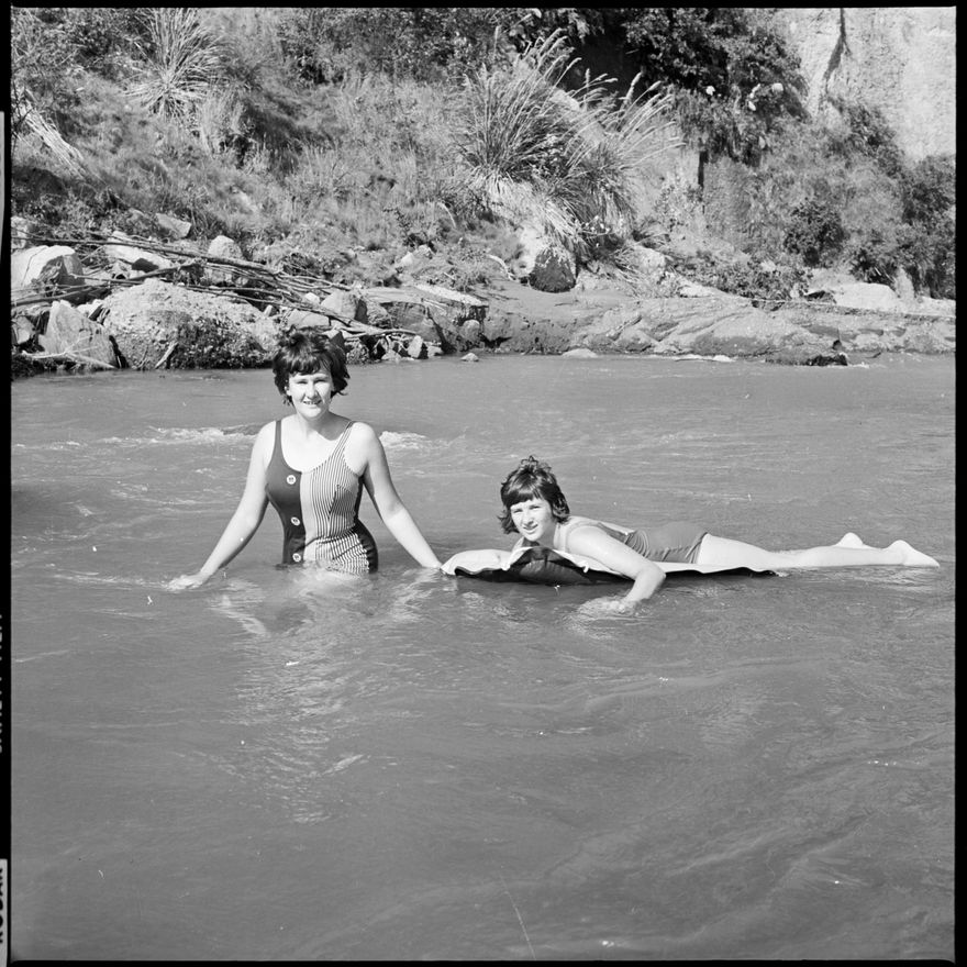 This image was taken for a story that ran in The Manawatu Evening Standard on 28th December 1965 ""Come on in the water: it's fine" say Loraine and Shirley Valentine, who, with their parents, of Palmerston North, are spending the Christmas and New Year holiday period camping at the Pohangina Valley Reserve. Sheltered from all winds, many families spent Boxing Day picnicking and bathing, or just sunbathing, at the Pohangina Valley Domain."