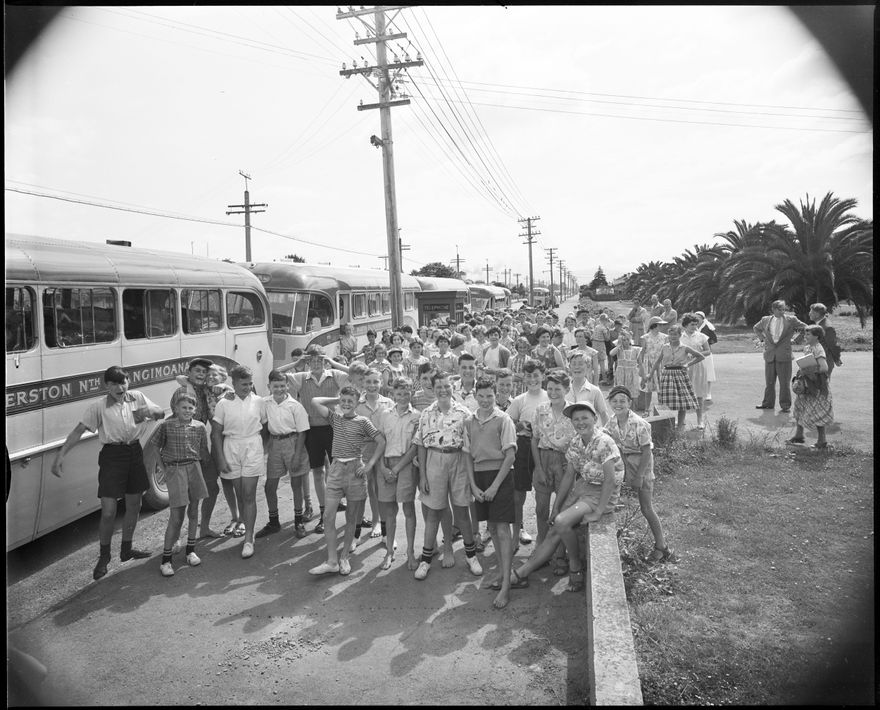 This image was taken for a story that ran in The Manawatu Evening Standard on 15 October 1955: [Group of pupils grouped together, waiting to board buses]