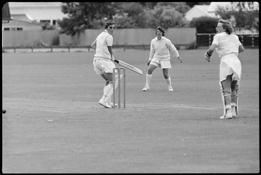 This image was taken (but not published) by the Evening Standard over the weekend of 3/4 January 1981. It depicts a moment of action from the Hallyburton Johnstone Shield 2-day match between the Central Districts women’s side and the Wellington women’s side. Wellington won by 135 runs.