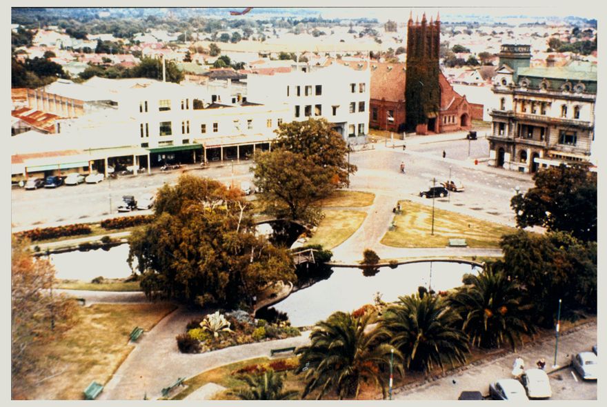 This photograph shows the corner of Church Street West and The Square. The buildings are: The Evening Standard Building (built 1937, demolished 1974 - new premises were constructed that same year), Poulsen's Radio Service and Home Cookery Restaurant (now part of the new Manawatu Evening Standard building), the Council Chambers (built 1944-1945, now Square Edge) and All Saints Church (this brick structure was built 1914 to replace an earlier wooden church). The Lakelet was constructed in October 1909. It was the main feature of the last quadrant of The Square to be developed by the Beautifying Society. James Nash, Mayor of Palmerston North 1908-1923, opened the Lakelet before a crowd on 27 October 1909. The Lakelet is shaped as a butterfly, with the wings being bisected by a bridge as its body. It is also referred to as the Butterfly Lake.