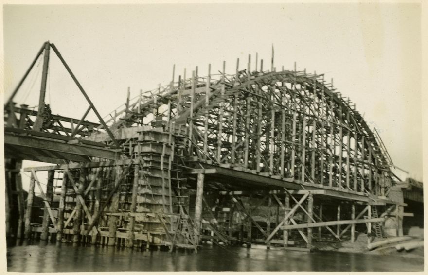The Fitzherbert Bridge, spanning the Manawatu River, Palmerston North, was built 1933 – 1935. A pile-driver is being used.