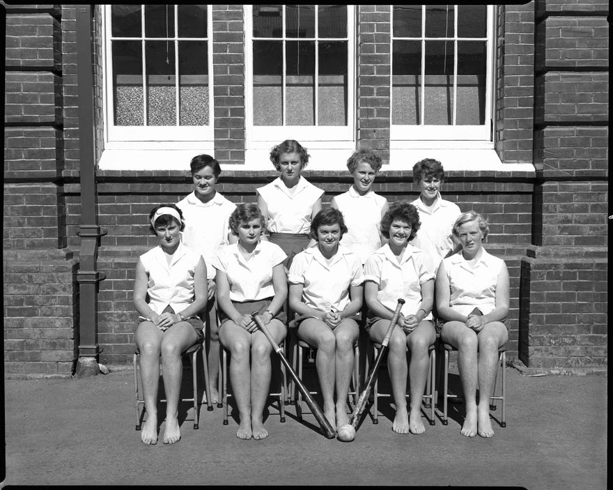 A group of nine female students from the Palmerston North Teachers' College pose with softball bats. This negative comes from the Elmar Collection - a large series of semi-identified and unidentified images from the 1930s-1970s.