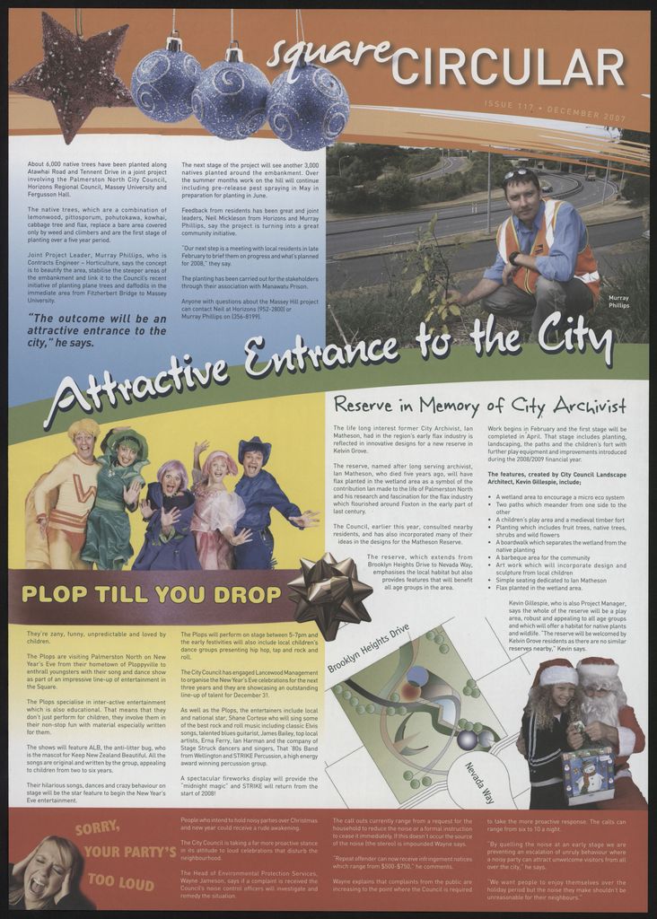 The Square Circular was Palmerston North City Council's monthly community publication, informing Palmerstonians of PNCC initiatives, activites, and events. This month's issue includes: Contact centre awards, dog control, electric bicycle, Grant Elliott, Ian Meyer, local initiatives fund, Matheson Reserve, New Year's eve in The Square, noise control, parking, public changing rooms, recycling centre, road maintenance, safety advisory board ,Student City, native trees.