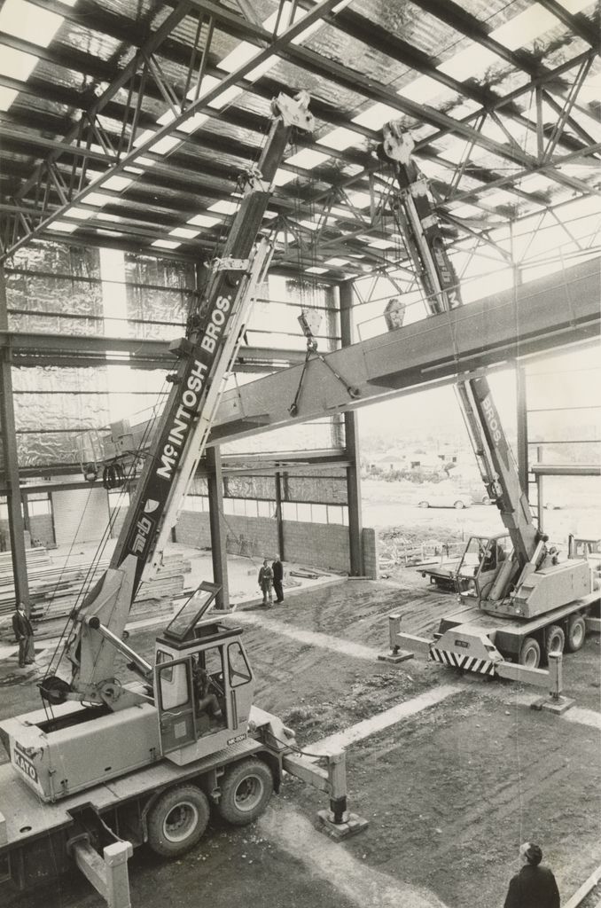 NZ Motor Bodies was established as Munt, Cotterell, Neilsen and Company Ltd in 1926, but the name was changed to NZ Motor Bodies in 1937. The business was situated in Petone until 1978 when operations shifted to Palmerston North. In 1983 the business again changed its name, to Coachwork International Limited. It was by then the largest builder of buses and coaches in New Zealand. The new Palmerston North NZ Motor Bodies plant, here under construction covered an area of 18,000 square metres. This gantry crane, being lifted into position, was 21 metres high and was used to transport buses within the plant over other work on the production line.