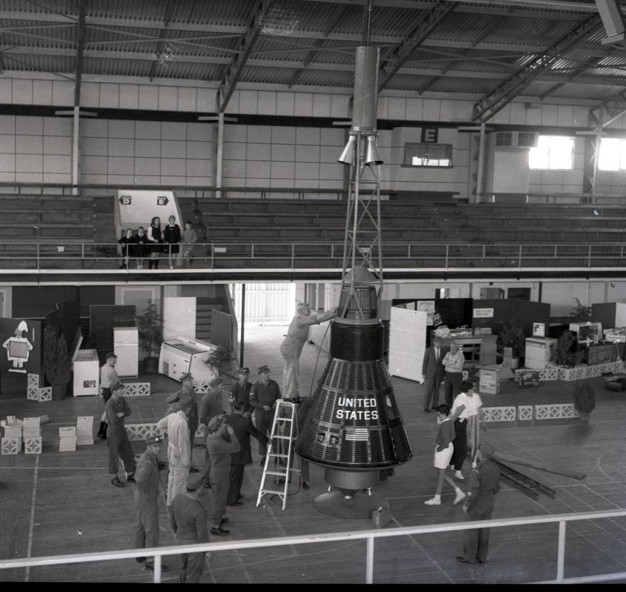 Caption stated: "The United States Mercury Space Capsule, lent to Palmerston North for special showing by the American Embassy has been installed in the Izadium (a stadium on the corner of Ferguson Street and Fitzherbert Avenue). The capsule will be on display this week as part of the Health Department's Clean Food Exhibition. Nearly an hour and a half late in arriving in the city yesterday, the capsule was brought here in four parts on flat-backed Army trucks. It has just been exhibited in Napier and before that in Auckland, Wanganui, Christchurch and Dunedin. Army helpers worked to fit the capsule containing a dummy astronaut, in takeoff position, on to its base. On top of this was fitted the second-stage of the rocket and above this again a long lattice work tower. Assembled the capsule stands over 26 feet high." Published in Manawatu Standard 8 October 1963.