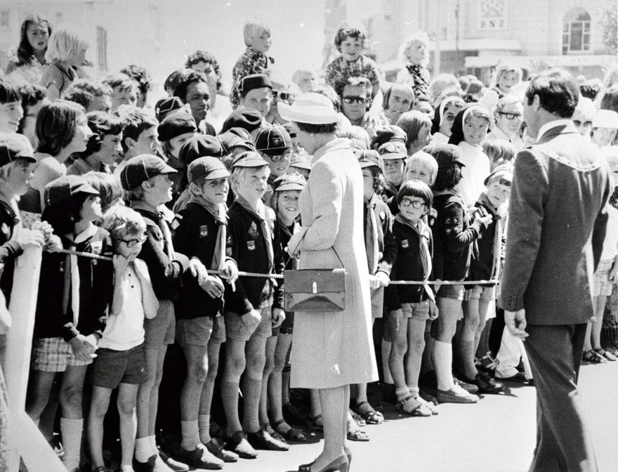 The Queen and Prince Philip visited Palmerston North on Saturday February 26th, 1977. In this photograph, the Queen is shown chatting with a group of boy scouts.