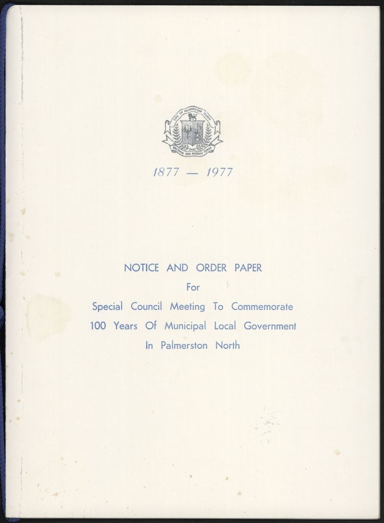Notice and order paper for a special Council meeting to commemorate the centennial of local government in Palmerston North.