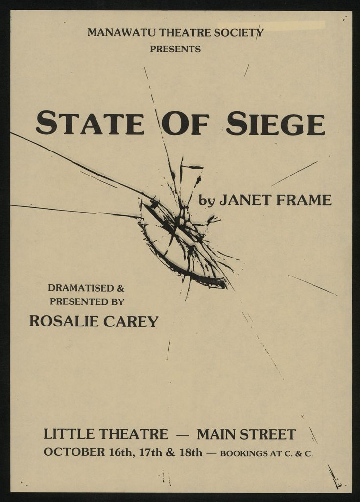 "Manawatu Theatre Society presents State of Seige by Janet Frame. Dramatised & presented by Rosalie Carey. Little Theatre - Main Street. October 16th, 17th & 18th - Bookings at C. & C."Part of a collection of posters that were displayed in the Public Library in the 1970s - 1980s.