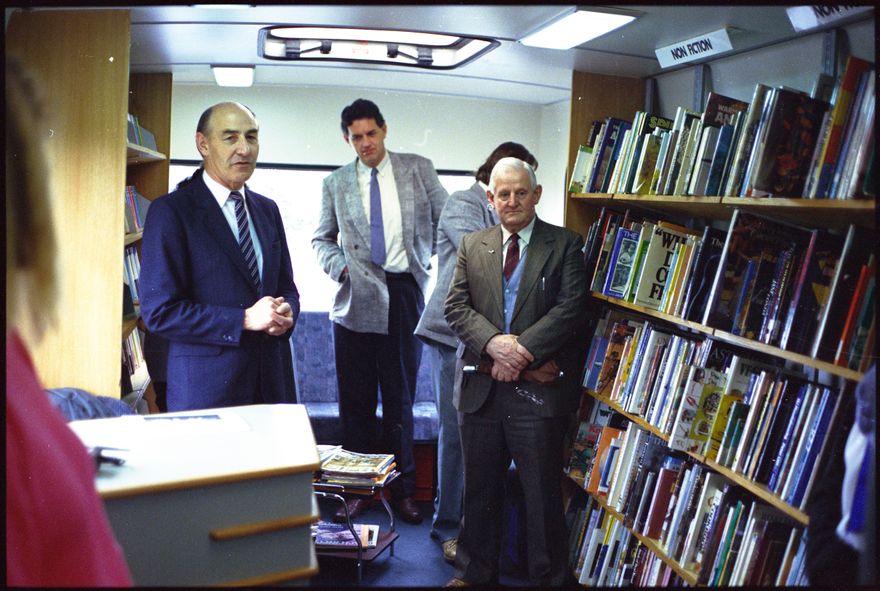 A new mobile library bus began service in 1989. This photograph shows (from left) the Mayor, Paul Rieger, Unknown, Anthony Lewis (Librarian - obscured) and Ian Cruden (Councillor) and what is believed to be the launch of the new bus.