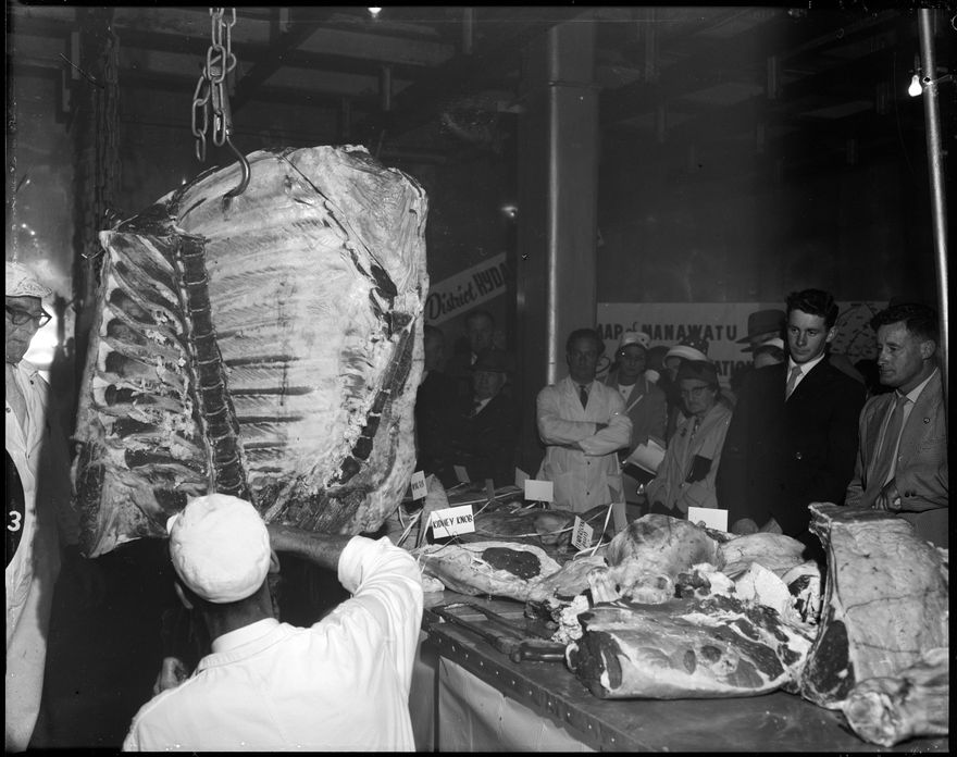 This image was taken for a story that ran in The Manawatu Evening Standard on 16 November 1960 "Some of the public who attended the Feilding Agricultural and Pastoral Association's fat lamb competition held at Messrs Borthwick's freezing works today are seen watching the cutting down of a side of beef."