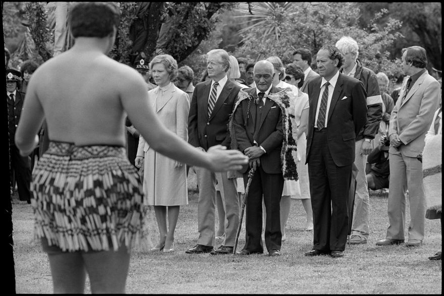 This image was taken by the Evening Standard on the 11th of February 1984 but was not published. It depicts former United States president Jimmy Carter and his wife Rosalynn during the wero at Parewahawaha Marae in Bulls.