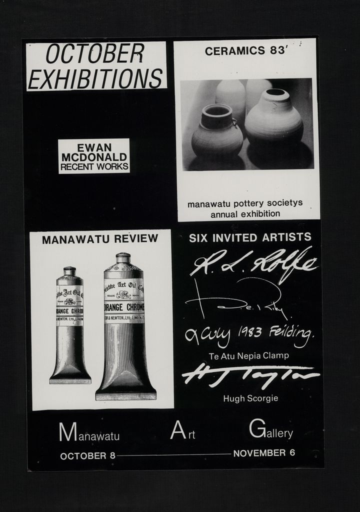 October Exhibitions: Ewan McDonald Recent Works; Ceramics 83'. manawatu pottery societys annual exhibition; Manwatu Review; Six Invited Arts. R L Rolfe, P.e. Riley, ? 1983 Feilding, Te Atu Nepia Clamp, H Taylor, Hugh Scorgie. Manawatu Art Gallery. October 8 - November 6'. Part of a collection of posters that were displayed in the Public Library in the 1970s - 1980s.