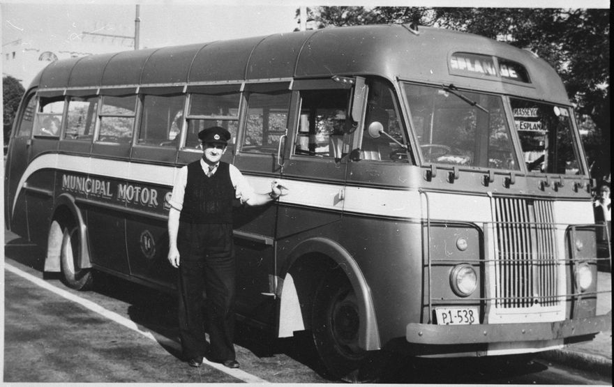 This photograph is of a bus driver with one of the Municipal Motor Service buses, evidently bound for the Victoria Esplanade.In the late 1950s, several Bedford Omnibuses were purchased by the City Council to complement the public service fleet. Two 8 1/2 ton, 37 seater buses were purchased in 1957. In 1958, two 33 seater, 8 ton buses were purchased. Finally, two 21 seater 5 ton buses were purchased in 1962.