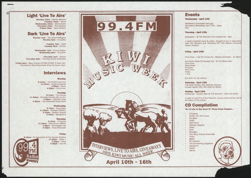 99.4 FM Kiwi Music Week. Interviews, Live to Airs, Giveaways. 100% kiwi music all week. April 10th-16th. 99.4FM radio Massey.