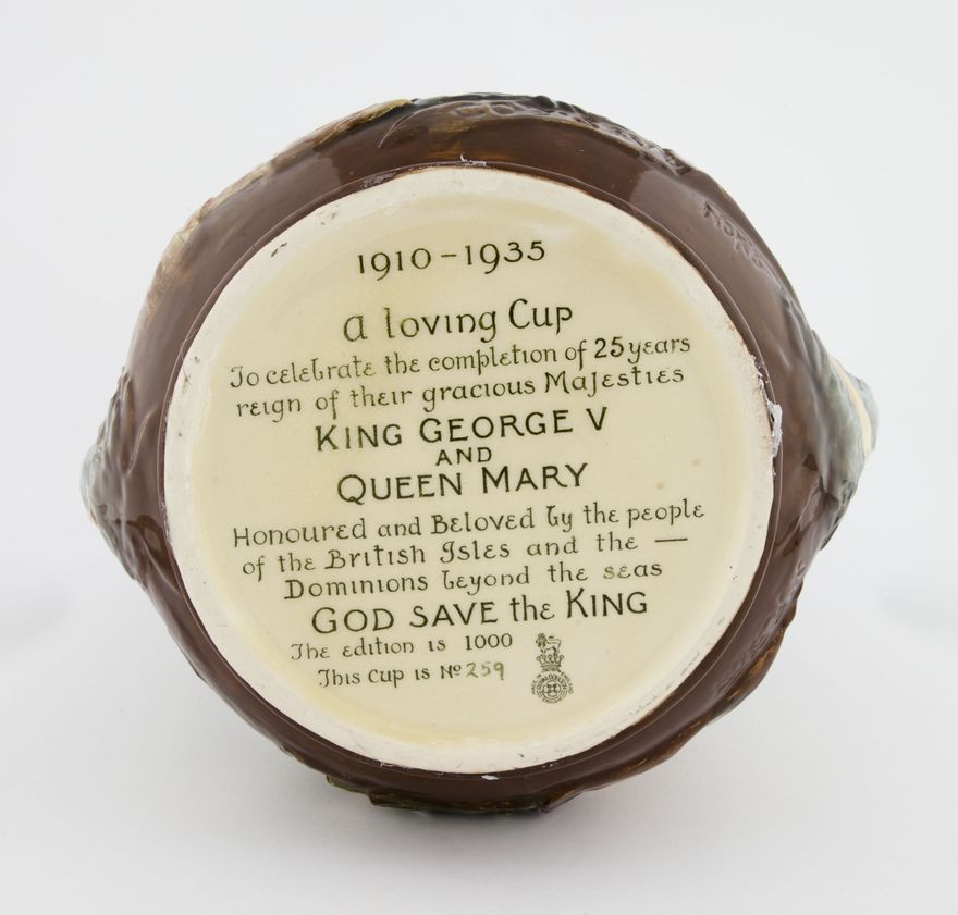 - A two handled 'loving cup' made by Royal Doulton. The cup is around 250mm tall. It is number 259 of 1000. The caption on the bottom reads '1910-1935; a loving cup; To celebrate the completion of 25 years reign of their gracious Majesties KING GEORGE V AND QUEEN MARY; Honoured and Beloved by the people of the British Isles and the Dominions beyond the seas; GOD SAVE the KING'.