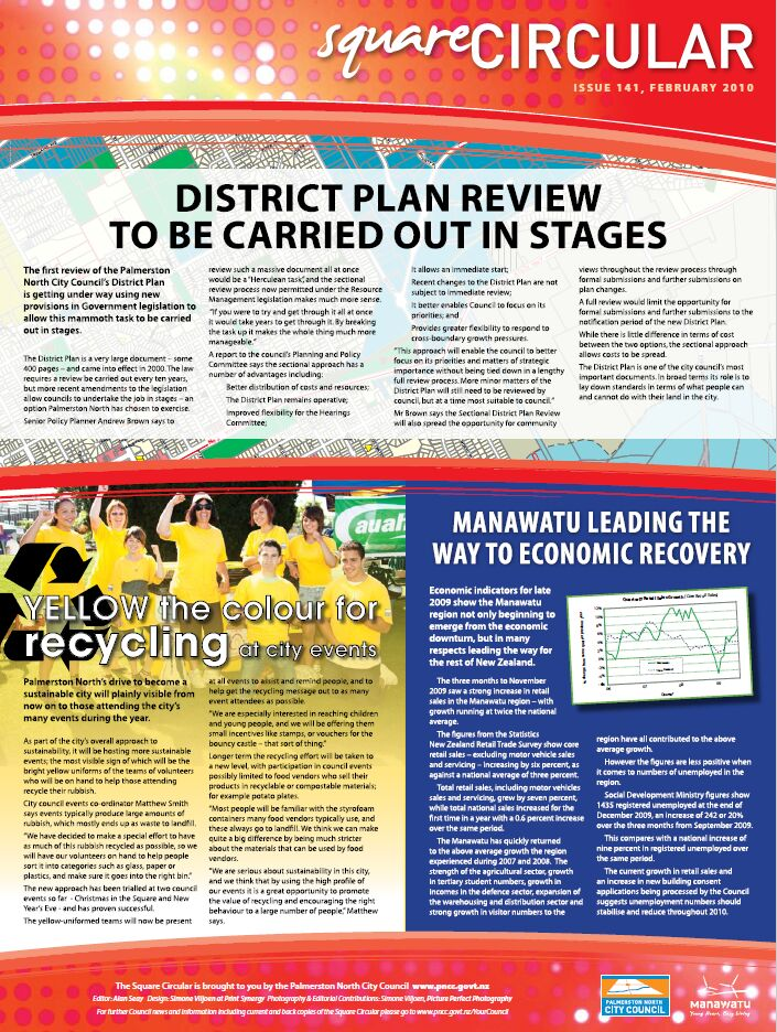The Square Circular was Palmerston North City Council's monthly community publication, informing Palmerstonians of PNCC initiatives, activites, and events. This month's issue includes: District Plan; Recycling; Economic Recovery; K-Loop; Aokautere; defence Hub; Cycling; Events; Children's Day; Festival of Cultures.