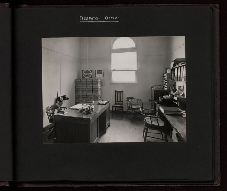 This album documents the Western Brewery Co. Ltd. premises in Bates Street, Whanganui. Photographs include: the despatch office; racking room; cask washing stage; racking machine; fermenting cellar; weiss cylinders; cask pitching room; gyle room; and refrigeration machinery.