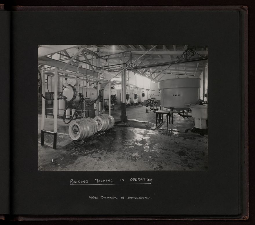 This album documents the Western Brewery Co. Ltd. premises in Bates Street, Whanganui. Photographs include: the despatch office; racking room; cask washing stage; racking machine; fermenting cellar; weiss cylinders; cask pitching room; gyle room; and refrigeration machinery.