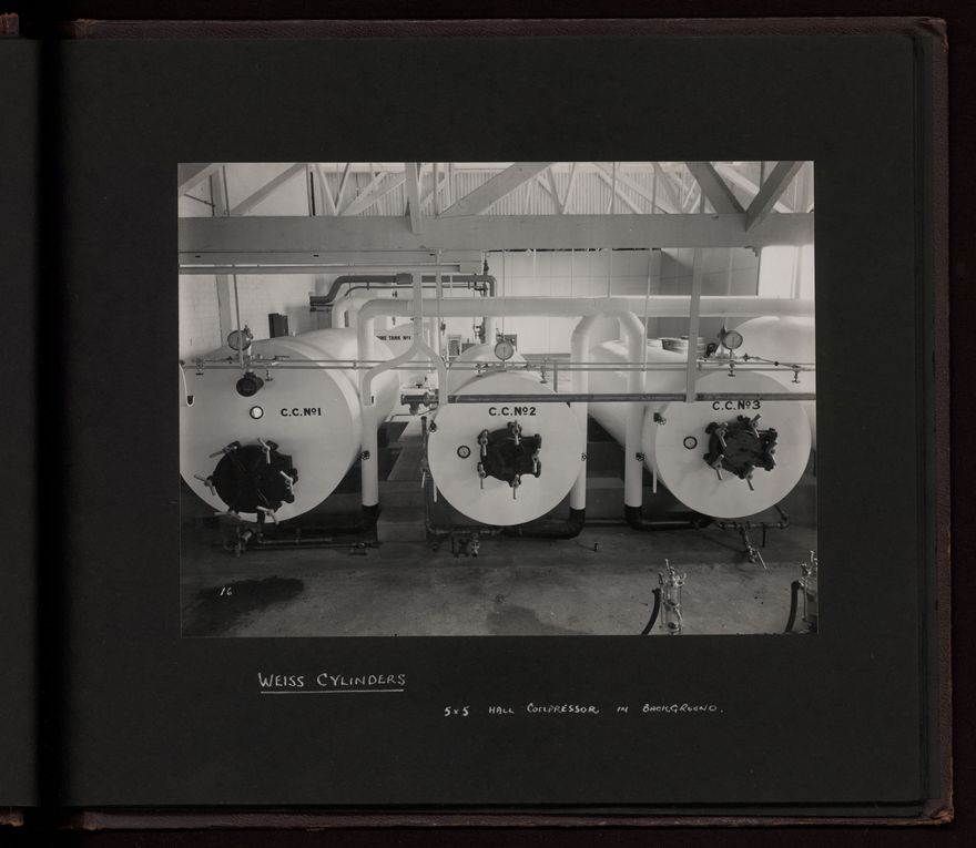 This album documents the Western Brewery Co. Ltd. premises in Bates Street, Whanganui. Photographs include: the despatch office; racking room; cask washing stage; racking machine; fermenting cellar; weiss cylinders; cask pitching room; gyle room; and refrigeration machinery.