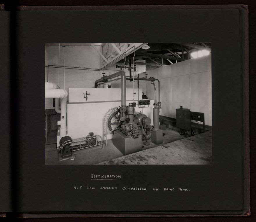 This album documents the Western Brewery Co. Ltd. premises in Bates Street, Whanganui. Photographs include: the despatch office; racking room; cask washing stage; racking machine; fermenting cellar; weiss cylinders; cask pitching room; gyle room; and refrigeration machinery.