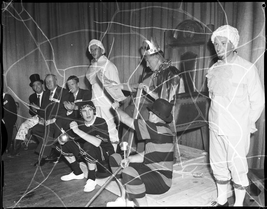 This image was taken for a story that ran in The Manawatu Evening Standard on 11 April 1961 "The newly-enthroned King of the Carnival studies a document which has just been presented to him. It entitles him to clothing which would be supplied by the retailers listed on it. The picture was taken at the "coronation" ceremony at the Concert Chamber on Saturday Night."