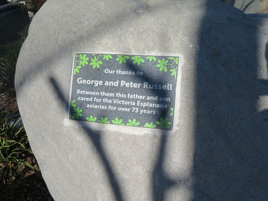 Plaque to George and Peter Russell father and son who as keepers at the aviary at Victoria Esplanade for over 73 years. the plaque is at the Central Energy Wildbase Recovery.