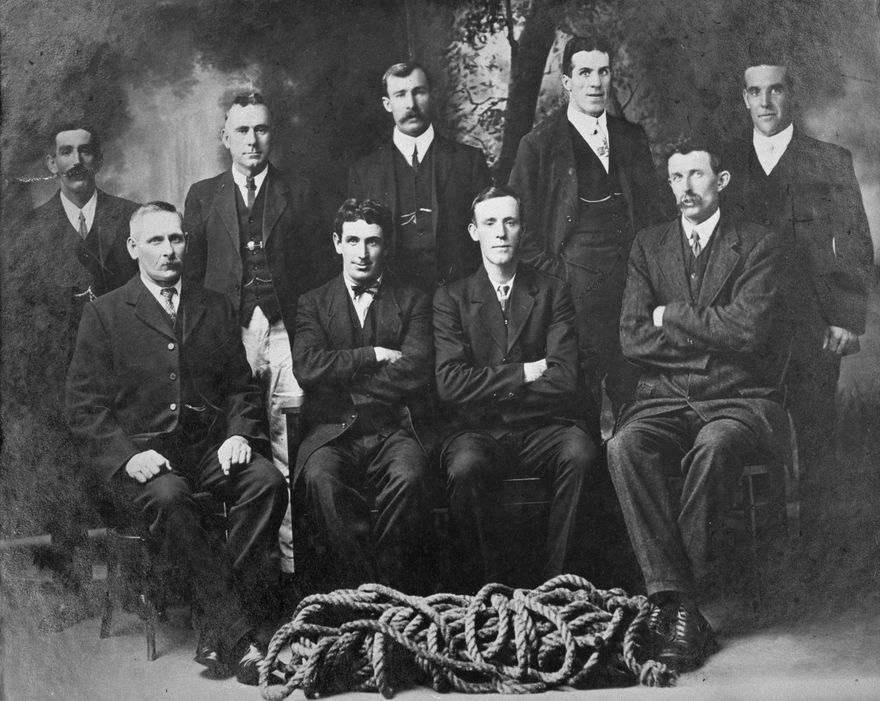 These men formed a tug-o-war team on picnic occasions. Some of the people who have been identified are; Back Row: far left Ernie or Bill Sutton, Stoker for many years; 2nd left George Barr. Front Row from left: Charlie Dawick; “Son” Ihle; unknown; Bill Brett(?)