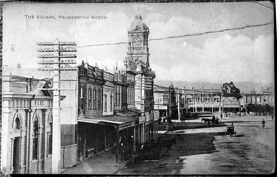 Looking from the corner of Broadway to the corner of Church Street East. Main Street West appears mid-way in the photograph. The buildings (from left) are: [1] Bank of Australasia. [2] Post Office built 1905-1906. The clock mechanism was named after Kerei Te Panau and was removed in November 1942 as an earthquake risk. [3] WF Durward, drapers from 1907-1915 (on the site of the Plaza, once home to the PDC building). [4] Bradfield's Grocery and Crown Studios.