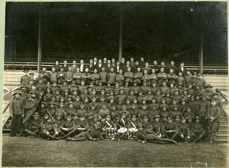 The Fifth Wellington Regiment at Palmerston North Camp, May 1915, shown in front of the Grandstand at Awapuni Military Camp. Note the men in civilian attire in the back two rows - these may indicate a shortage in uniforms, something which did occur in the larger camps. The men just in front of them are wearing an unusual collarless jacket, but their belts indicate that they are military.