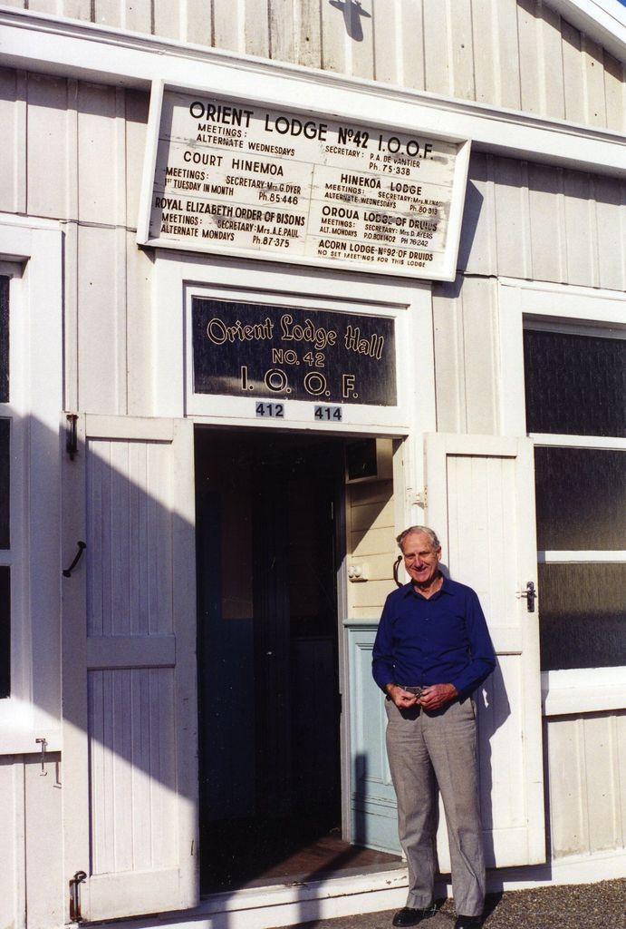 The Orient Lodge of the International Order of Odd Fellows has been operating in Palmerston North since c1885. This building served as their meeting hall until the late 1990s. Meetings were also held by Court Hinemoa, Hineroa Lodge, Royal Elizabeth Hall of Bisons, Oroua Lodge of Druids and the Acorn Lodge No.92 of Druids. Standing outside the building is Mr. Frank Rose. The building was later sold to the Van ufflen Gallery and used for storage until being renovated as a Restaurant and bar, The Gallery, which opened c 2006.