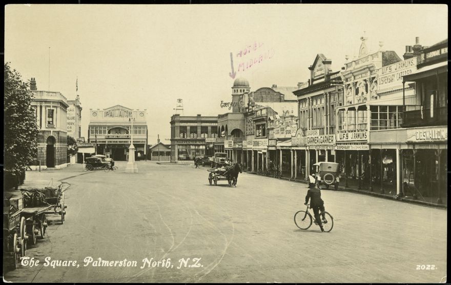 This postcard shows Coleman Place from 1923. There are several interesting things to note in this image. The Everybody's Picture Theatre (with the domed roof) was built in 1913 for Arthur Hopwood who leased the land. It was remodelled as the “Hotel Midland” in 1928, which operated under the license from the Occidental Hotel which burnt down in 1927. Much of the Hotel was demolished in 1965-1966. The Palace Theatre was built in 1915 on the site once occupied by the Manawatu Stables. The tower structure that can be seen poking above the Harvester Co. building (currently occupied by Youth Space [2017]) is a bell tower that was used to alert the city in case of fire.