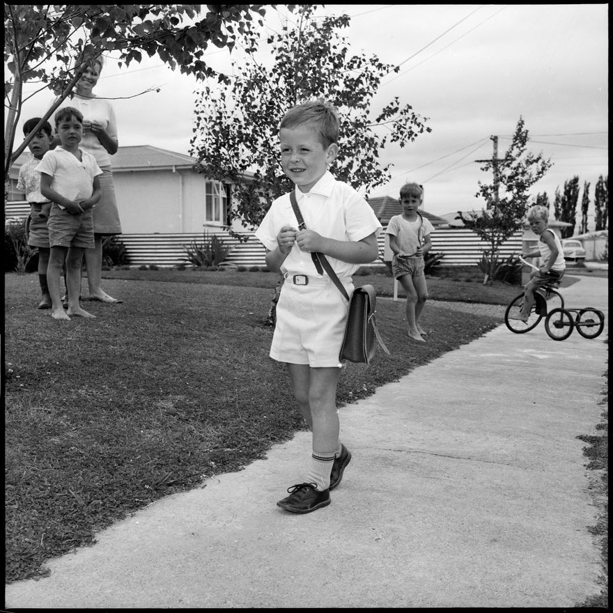 This image was taken (but not used) for a story that ran in The Manawatu Evening Standard on 19th January 1966 [Christopher Plumtree, all dressed up as for the day when he goes to Terrace End School.]"
