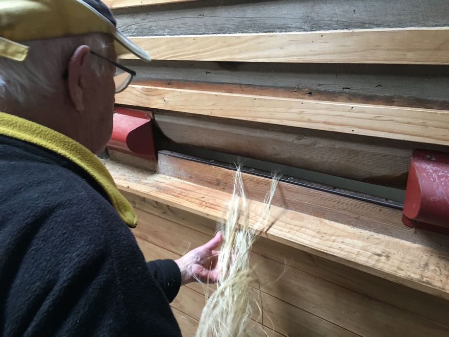 The final stage in the preparation of the flax fibre is Scutching; a process in which the dried flax fibre is polished between two wooden surfaces.