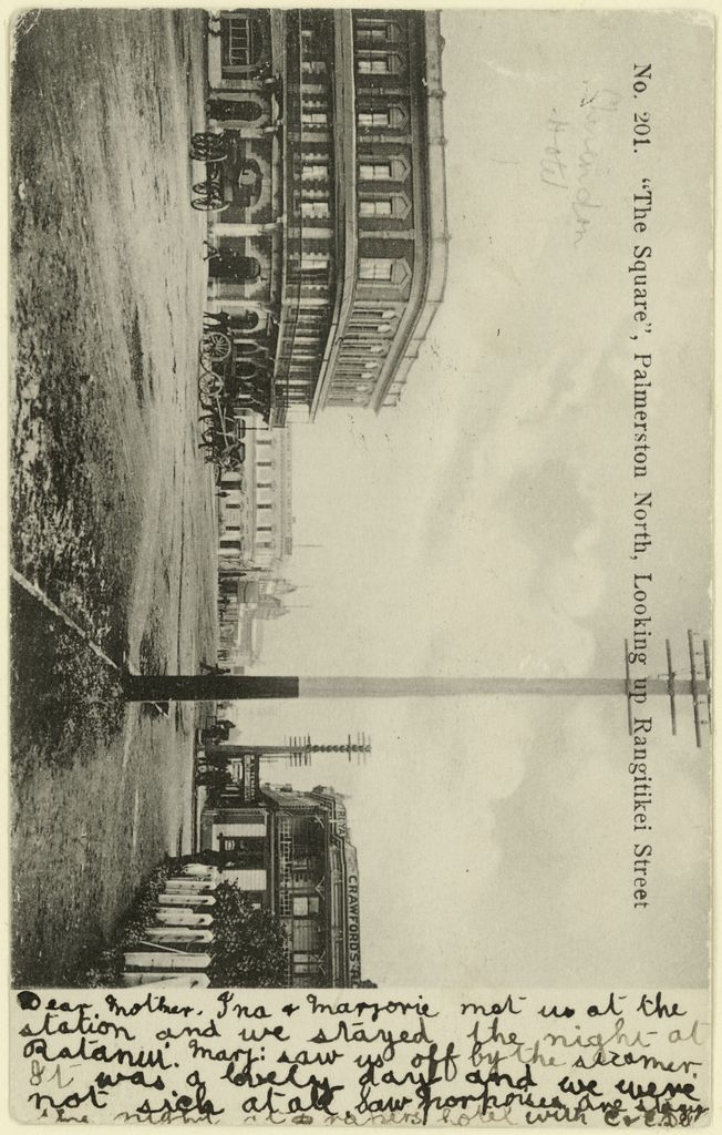This postcard is addressed to "Mrs CJ Monro, Craiglockhart, Palmerston. 20 December 1906." The front reads: "Ina and Marjorie met us at the station and we stayed the night at Ratanui. Mary saw us off by the steamer. It was a lovely day and we were not sick at all. Saw porpoises. [We] are staying the night at [illegible] hotel with C & E. DG" The view looks up Rangitikei Street from The Square. This postcard shows a view of Rangitikei Street from the Square and was taken around 1906. The building on the right is the Royal Hotel, which was established in Palmerston North about 1871. Over the years the building was repeatedly enlarged and improved. In 1915, the Bank of New Zealand erected their premises on this site and the licence was transferred to a building further up Rangitikei Street to what had been Dawick's Buffet. The left side of the photograph shows the three-storied brick Clarendon Hotel, which was constructed in 1904, after fire had destroyed the earlier wooden hotel. Mr H Baker was the Proprietor. Further along the street is the Johnston and Sim Land Agents. There is a sign on the building that indicates this is also the location of the offices of Manawatu Racing Club and NZ Government State Fire Insurance. The premises of Barraud and Abrahams is visible further down the street. See 2014P_St25_009008 to see the photograph that this postcard was made from.