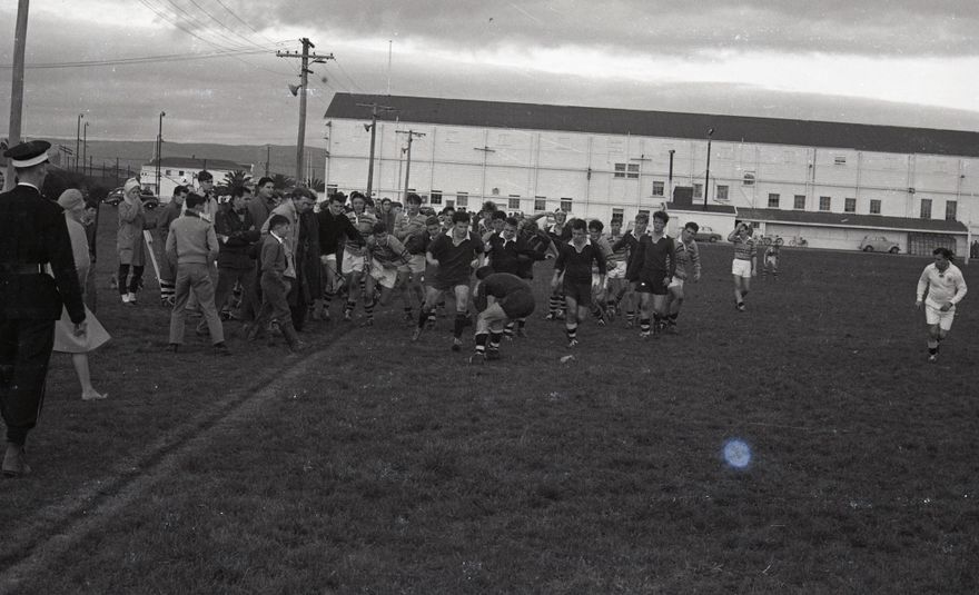 Caption: "Kia Toa 3rd grade Rugby team beat the Old Boys team. Kia Toa have to date won every game with seven points ahead and with only two games to play are a strong contender to win their grade competition."
