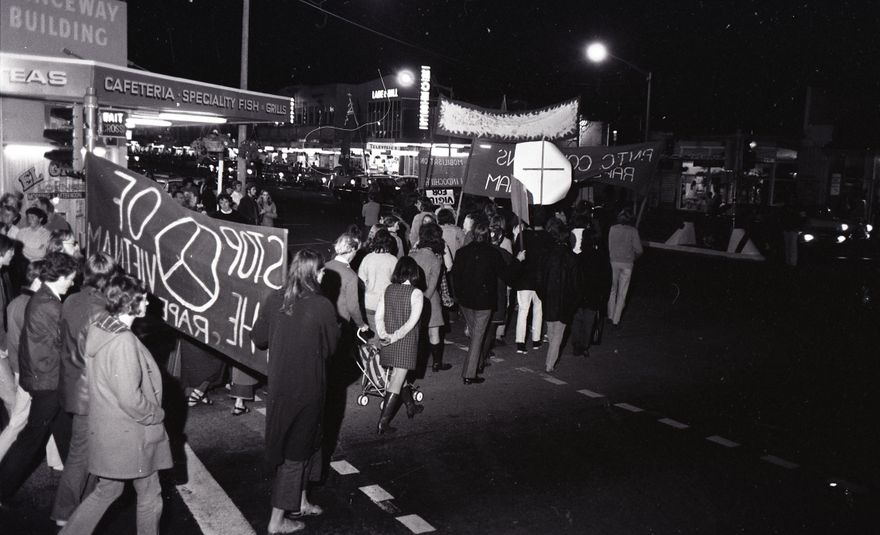 The March was organised by the Palmerston North Anti-war Mobilisation Committee, including R. Lyall, Massey University Student Association President Gary Emms, and Unionist Alan Millar. The Nash Street Jug Band lead the singing and Hana Burke sang ‘a Maori song of parting’. Poetry was read by Mr. Lyall and Des Woods. The Reverend Loyal Gibson of the Trinity Methodist Church lead prayers after Churches across the city rang their bells in solidarity.
