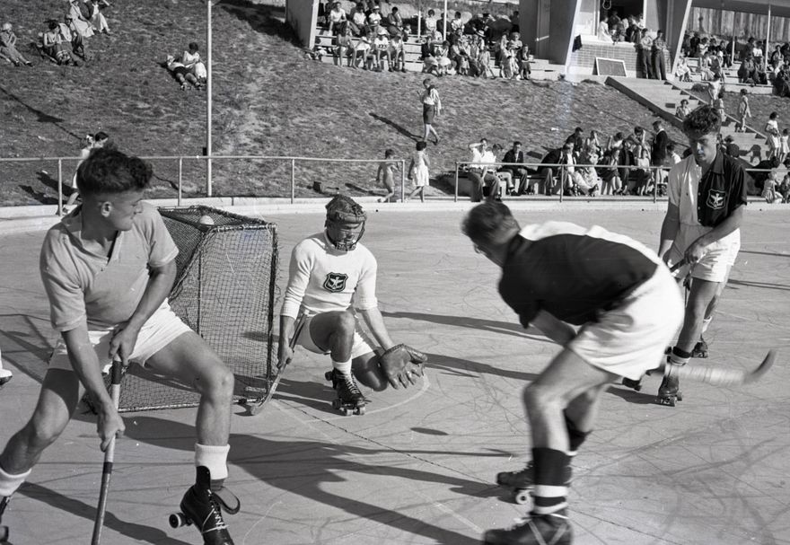 This image was taken for a story that ran in The Manawatu Evening Standard on 2 April 1956: "Palmerston North played Paraparaumu Beach and Hastings in the Central Districts amateur roller hockey tournament at Memorial Park last Saturday (March 31). Hastings scored an outright win when they came through the five games without loss. The second place were Paraparaumu Beach, with Palmerston North third"