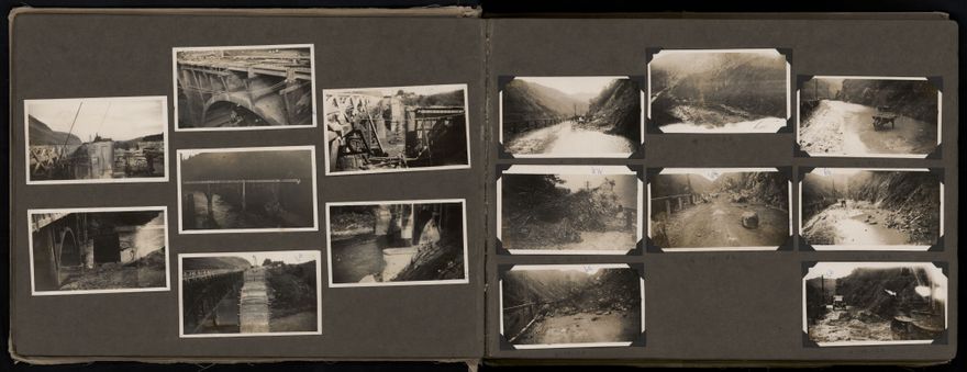 Dated from the 1920s and 1930s, this photograph album depicts events on the Manawatū Gorge road including construction and repairs of the road, removing slips, car accidents etc. The album also contains images of Napier following the earthquake of 1931. The photographs were shot by William (Bill) Brockie. Individuals are unidentified.