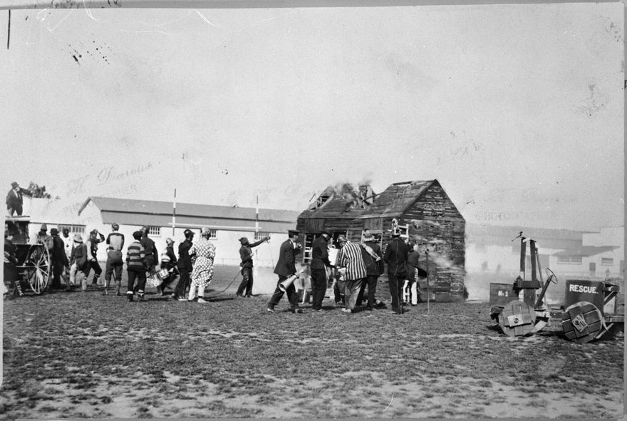 A humorous group called the 'Darktown Fire Brigade' giving a demonstration of a fire rescue at the Palmerston North Showgrounds. The 'Fire Brigade' was raising moeny for the A & P Association.