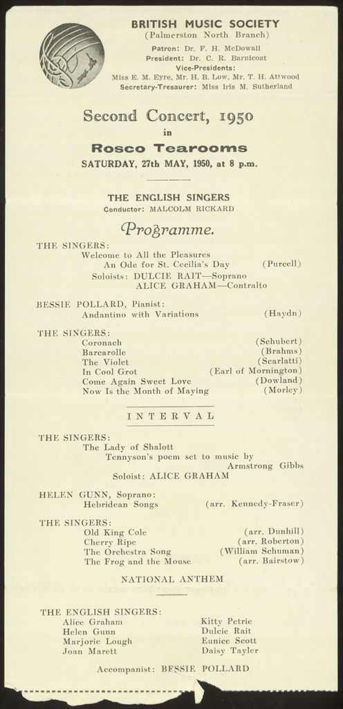 The second concert of the 1950 season, put on by the British Music Society, Palmerston North Branch, was held in the Rosco Tea Rooms, 27 May 1950, at 8pm. From the archive of 'C M Ross & Co Ltd'.
