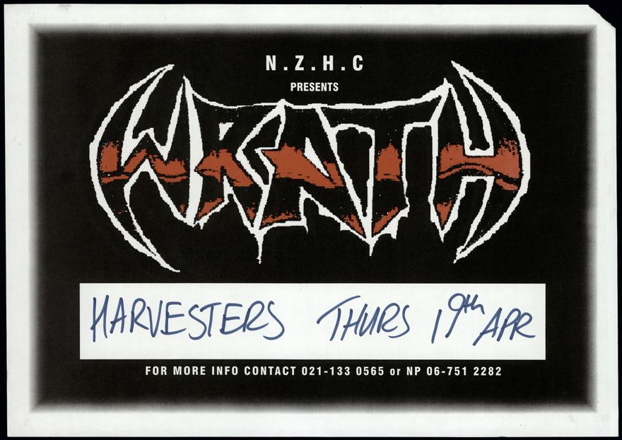 N.Z.H.C presents Wrath. Harvesters Thurs 19th Apr. For more info contact 021-133 0565 or NP 06-751 2282. Part of a collection of posters that were displayed at The Stomach, Lombard Street, venue for Creative Sounds Society Incorporated.