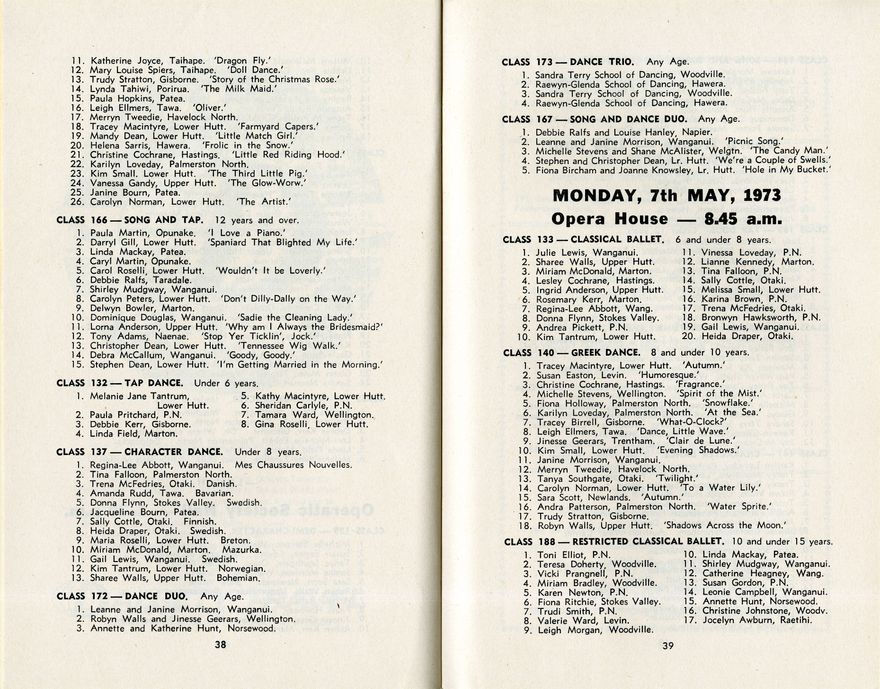 This is the programme for the Fiftieth Annual Festival of the Manawatū Competitions Society, which was held at the Opera House, Concert Chamber, Baptist Hall and St Andrew's Hall between 5 May and 9 May 1973. The competition categories included speech and drama, dance and music (both vocal and instrumental). Most entrants were children or young people. In addition to listing the events and names of competitors, the programme features advertisements for local businesses. This includes full page ads for Beggs (music store); Te Papaioea (musical production); Consumer's Co-operative Society (Manawatū); Manawatū Knitting Mills Ltd; Dalgety Travel: Splashe (soft drinks); and Collinson & Cunninghame Ltd (department store).