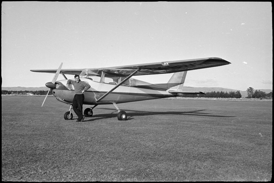 Caption: “Brian Milne with Middle Districts Aero Club’s new Cessna 172A. The air ambulance-taxi which is exceptionally quiet has a cruising speed of 117 m.p.h. [miles per hour] and is recognised by the ‘jet-flo’ tail.”
