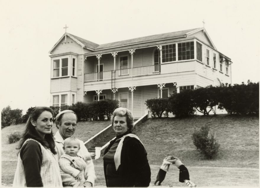 This convent building was formerly the home of the Brigidine nuns who taught at St Mary’s Convent School. The Foxton Retreat Trust took over the building in 1982, to run it as a sanctuary for people living in stressful situations. From left: Mr and Mrs Robert Allen and child; Mrs Anne MacMillan, Foxton Retreat Trust.