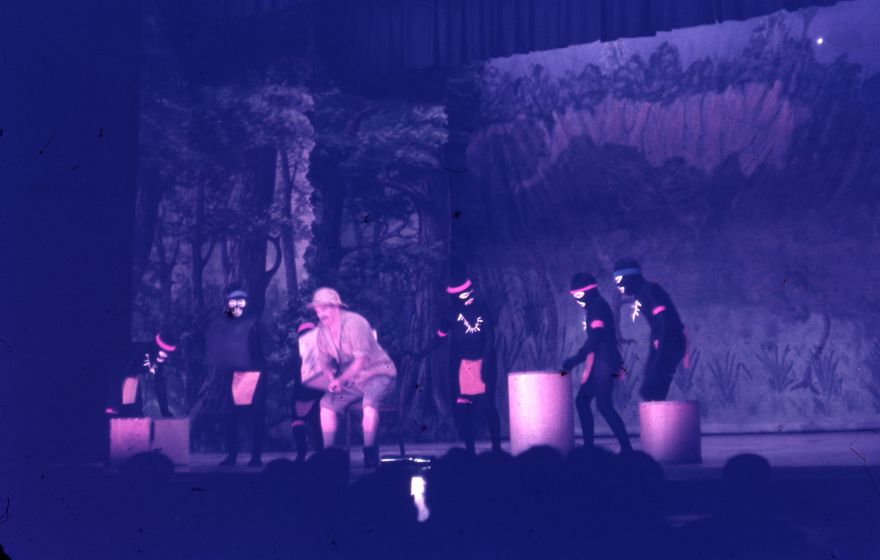 This image depicts Scouts in black body stockings and "African native" accoutrements surround a person in pith helmet, khaki shirt and shorts, are performing at the Gang Show 1963.